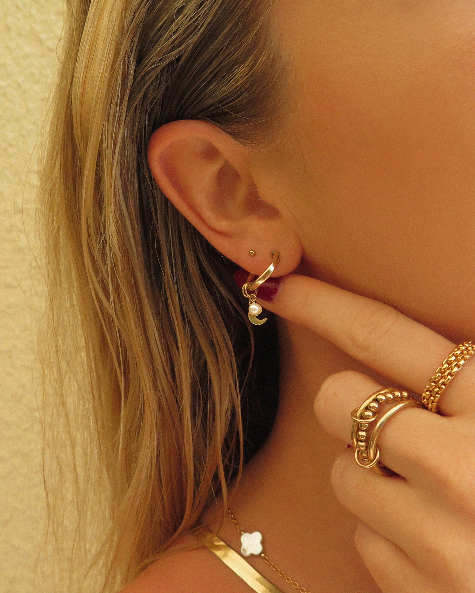 A golden ode to moonlit moments and soft femininity, these earrings blend celestial charm with modern minimalism. Featuring removable crescent and pearl charms, they’re the versatile go-to for weekend brunches, sunset spritzes, and date-night glow-ups. Made from 14k gold fill, they’re tarnish-resistant, hypoallergenic, and lightweight enough to wear from day to after-dark.